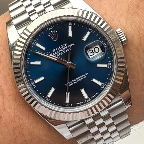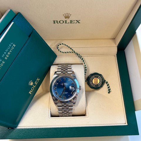 Rolex Datejust 41mm - 126300 med den nydelige skiven Bright Blue og jubileet lenke vurderes solgt.