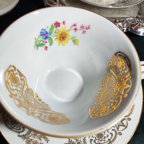 Vintage porselens-tesett fra Bavaria, Tyskland, preget av fine detaljer og gullkant.
