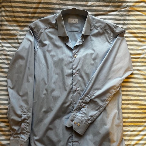Selger en lite brukt Eton skjorte i pastellfarger. Fin skjorte som kan brukes enten casual eller i dress. Jeg har vokst ut av skjorten så har dessverre ikke fått brukt den så mye.