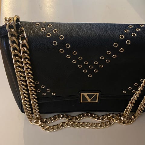 Victoria's Secret håndveske i lær for dame. Vesken har en svart farge med quiltet mønster og gullfarget kjede som skulderrem. Innvendig har vesken et rom med speil, foret med stripete stoff.