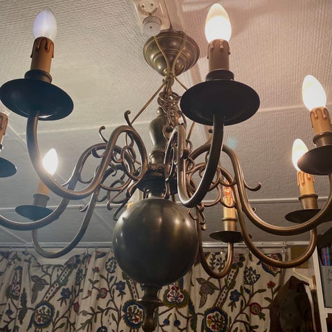 Lysekrone i messing med fem armer og kjede for oppheng. Passer for belysning i stuer eller spisestuer.