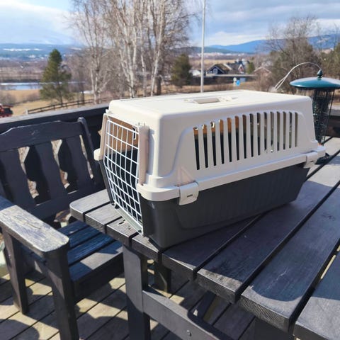 Alt for en katt eller en liten hund. Den hvite delen som blokkerer dyrets passasje må justeres litt. Stopperen er akkurat låst. Alt er avbildet.