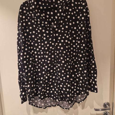 Størrelse 38, stoffet er lett gjennomsiktig, passer godt til svarte bukser.