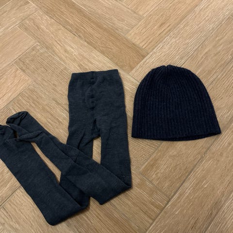 Lue og to parr leggvarmere med reflekstråd 600,-kr
