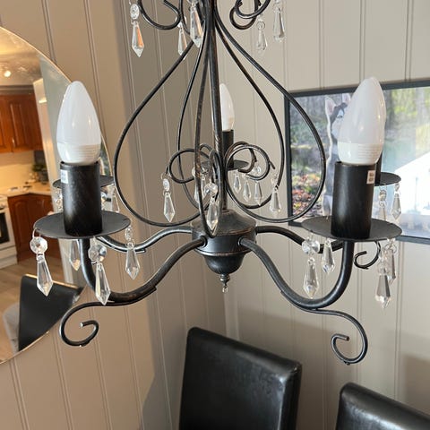 Seks-armet lysekrone i krom stål selges. Den er pent brukt, men bærer preg av litt støv. Vi selger den som den er, rett og slett fordi vi har endret litt stil og fordi den helt sikkert vil trives i nye omgivelser.