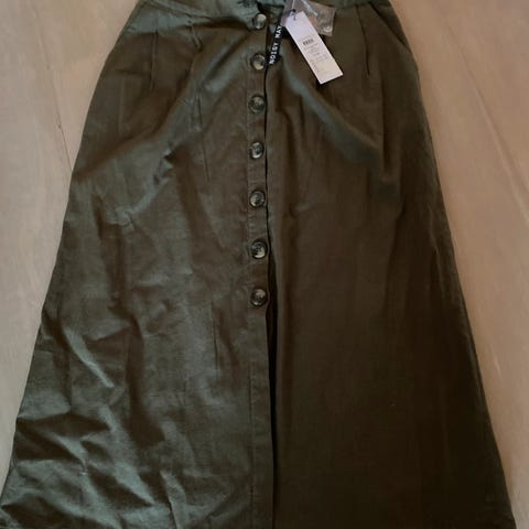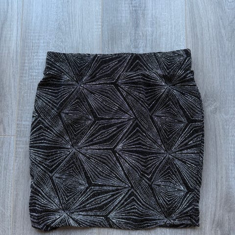Svart lårkort skjørt. Knepping foran og lommer på siden. Belte i livet.
