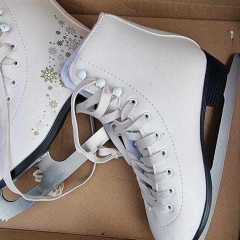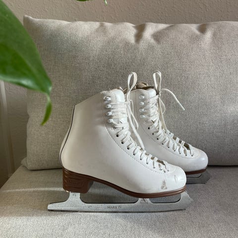 Danseskøyter i str. 35. De er brukt pent i to sesonger. Brukt pent og tørket av jernet etter hver trening. Selges som de er.