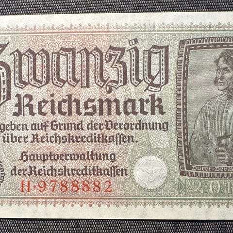 Fünfzig Reichsmark-seddel utstedt i Tyskland i 1929. Brukt i Norge under annen verdenskrig Seddelen har detaljerte trykk og er et eksempel på tysk valuta fra perioden. Den inneholder tekst og bilder som representerer tidens design og økonomiske historie.