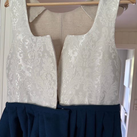 • Designdetaljer: Dyp V-hals brodert kjole båret over en skjorte med krage, tradisjonell estetikk med moderne eleganse
