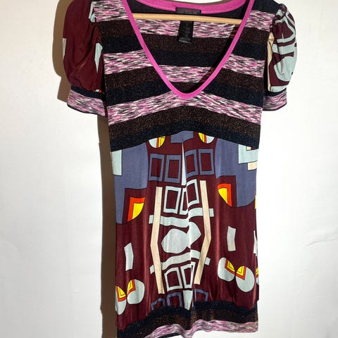 Custo Barcelona bluse i flerfarget silke, størrelse M. Blusen har langermet design med mønsterdetaljer og knappelukking foran. Egnet for kvinner.
