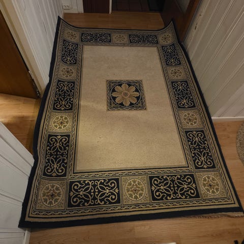 Teppet har flere flekker og bruksmerker. Er ikke forsøkt vasket.