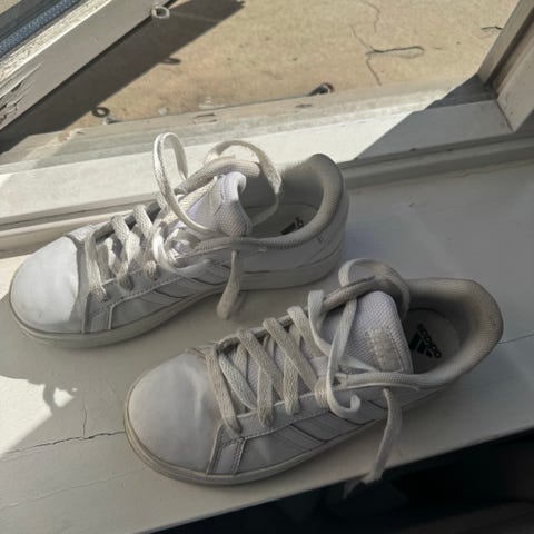 Adidas unisex joggesko i størrelse 35, hvit farge. Skoene har en lett og pustende konstruksjon, egnet for barn. Sålen gir godt grep og støtte under bruk.