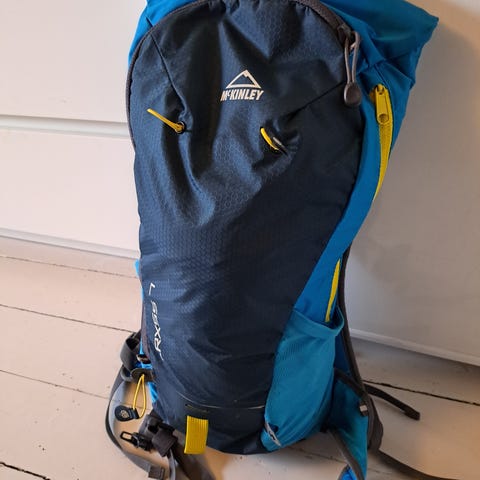 Bergans sekk med regntrekk. Ca 20 liter. Brukt som skolesekk. Hel og grei. Men synlig brukt. Selges 100 kr