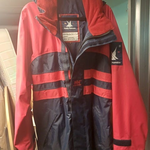 Selger en rød og blå jakke. Den er en stor størrelse og slipper ikke inn trekk. Det er en rød glidelås på innsiden som skjuler hetten. Kan diskuteres, send meg melding)