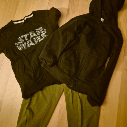 I tillegg følger det med en mørkeblå legging i størrelse 130, også fra H&M, som har lette bruksspor, men fortsatt er i god stand.