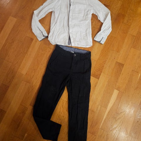 Hvit skjorte og pen, mørk marineblå bukse. Perfekt antrekk til jul. Skjorte str 140, bukse 152, men har blitt brukt sammen her