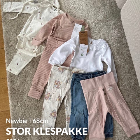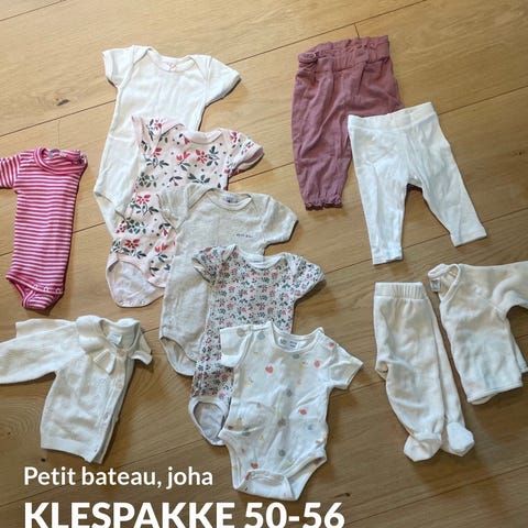 Pakke med 3 sett babyklær i størrelse 62. Inneholder klær i ulike farger og materialer, egnet for små barn. Hust and Claire, Lindex og Cubus