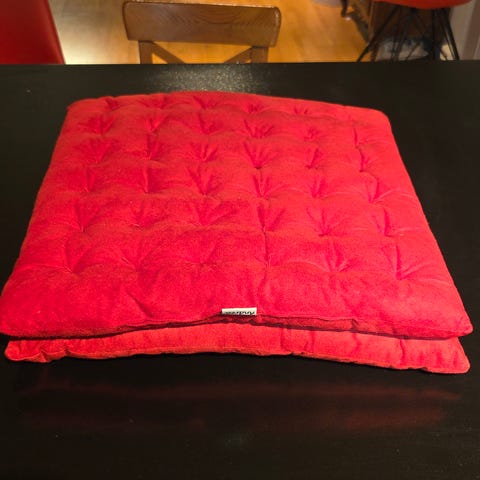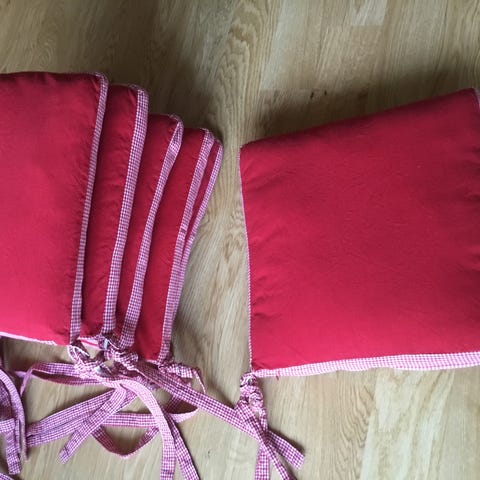Selger et sett med fire (4) tykke og komfortable sitteputer, perfekte for å gjøre stoler mykere og tilføre farge til rommet (spesielt fint til jul!).