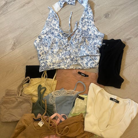 Klespakke til dame str M. Kjempegod blå litt løstsittende penbukse,en helt ny tights, og to pen topper😍✨ selges samlet til 150kr. Alt er lite brukt, tightsen er helt ny med lapp på. Kan hentes på Sveberg eller sendes mot porto.