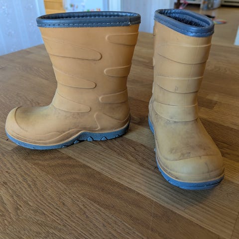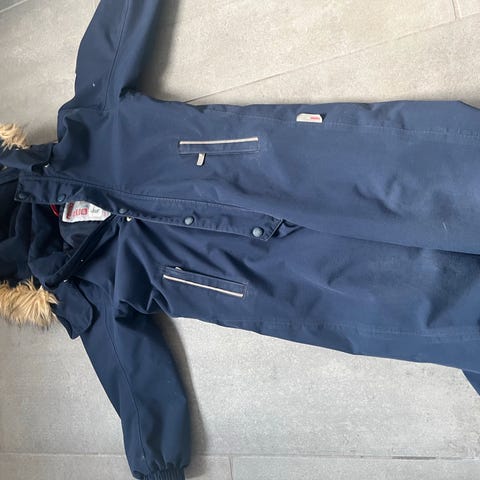 Bilde 2: Str 3 år: Bruse regntøy, regnbuksen er lappet på knærne pga slitasje. Det er ikke hull under lappene, eller andre kjente hull. Regnjakken er godt brukt, men ingen kjente hull.