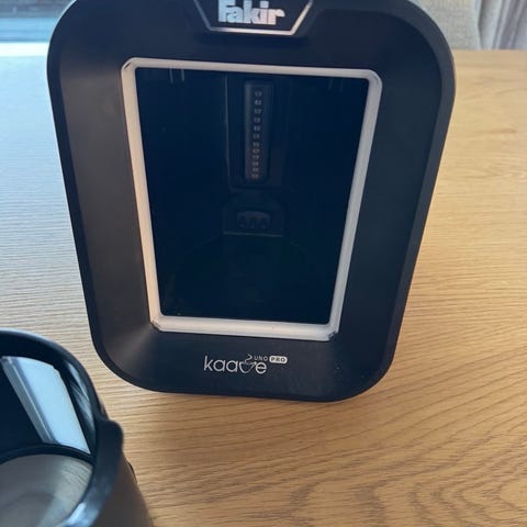 Enheten har betydelige fysiske skader, inkludert en stor bulk på siden og flere sprekker i den svarte plastbasen/undersiden (se bilder). Skaden stammer fra et kraftig støt.