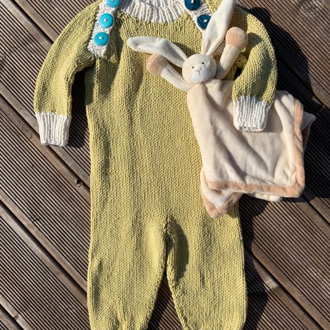 Sidan dette settet er strikka i babyull varmer det godt og eg ønsker at andre skal ha glede av det. God opning i halsen slik at degenerert er enkel å ta av og på. Selane på buksa kan kryssast i ryggen slik at dei blir strammare. Settet kan difor brukast lenge.
