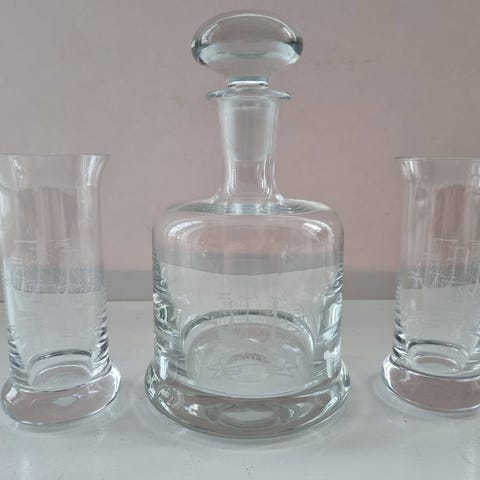 Karaffel fra Norske løve i god stand. 3 glass.To glass med små skår, følger med om ønskelig