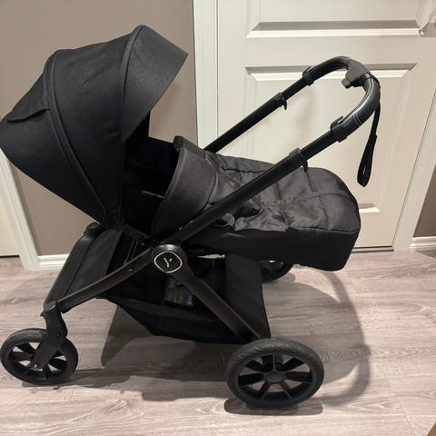 Yngri barnevogn i svart farge. Barnevognen inkluderer justerbart håndtak, avtakbar frontbøyle, og stor kalesje. Den har fire hjul med god støtdemping og et romslig understell for oppbevaring. Passer for barn i småbarnsalder.