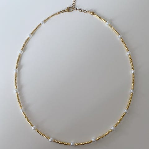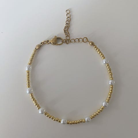 Håndlaget armbånd med blomster laget med glassperler i hvit og gull. Låsen er i 24K gullbelagt rustfritt stål. Smykkepose medfølger🛍️