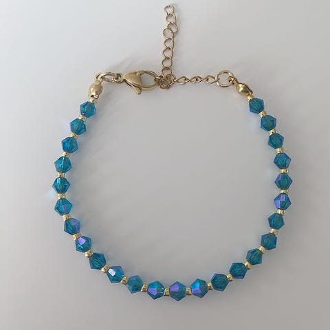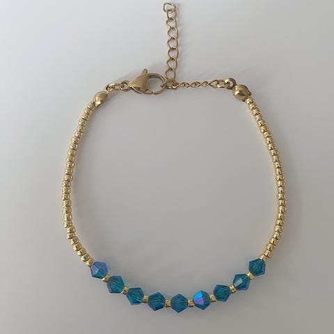 Håndlaget armbånd med blå krystallperler og gullfargede glassperler. Låsen er i 24K gullbelagt rustfritt stål. Smykkepose medfølger🛍️