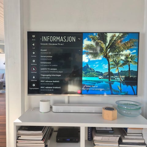 Vi er flyttet og har ikke lenger plass til denne TVen, den er pent brukt og ingen bruksmerker. Det er LG 55, modell 55UR8000GL7. Pris elkjøp.no 4487,- ( se bilde)