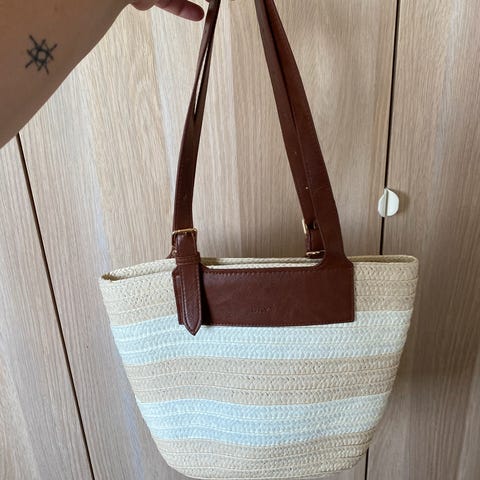 Nydelig stråtveske fra Day ET. Denne dype skuldervesken er heklet i et slitesterkt stråmateriale som gir et lett og naturlig uttryk. De myke avrundede hankene gjør den behagelig å bære over skulderen, den har en rund bunn og lukkes med trykknapp. Med sin elegante form og lette design er den et stilfullt og funksjonelt valg til sommerens aktiviteter.