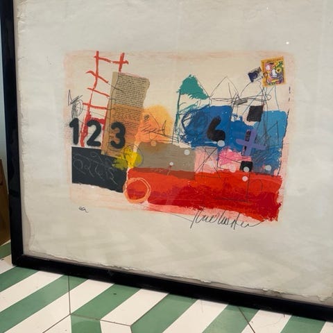 * Stilen er impressionistisk eller skisseaktig, med synlige penselstrøk og håndskrevne notater eller skriblerier i bakgrunnen og forgrunnen.