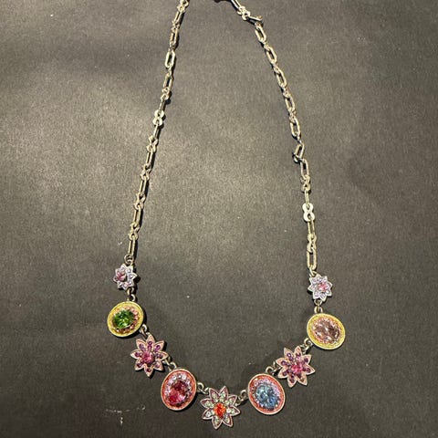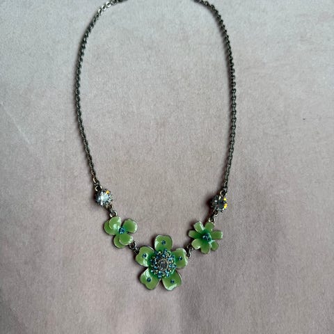 Pilgrim smykkesett bestående av halskjede og armbånd. Begge deler har lenke i metallfarge med blomsterdekor i turkise og grønne nyanser, samt små dekorsteiner. Halskjedet har justerbar lengde med forlengerlenke og karabinlås. Armbåndet har tilsvarende design med justerbar lengde og karabinlås. Smykkene passer til bruk til hverdags eller ved anledninger der man ønsker et koordinert sett med blomsterdetaljer i turkise toner.