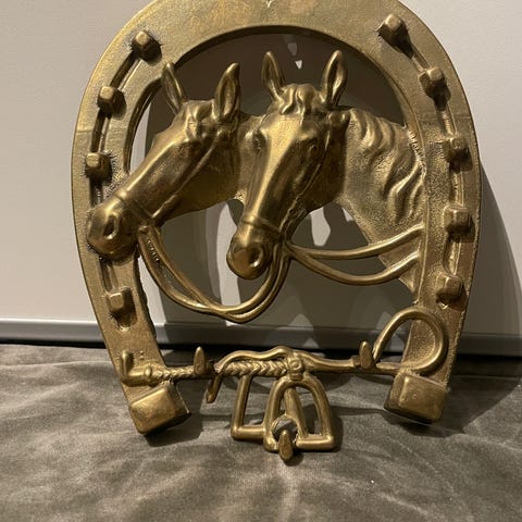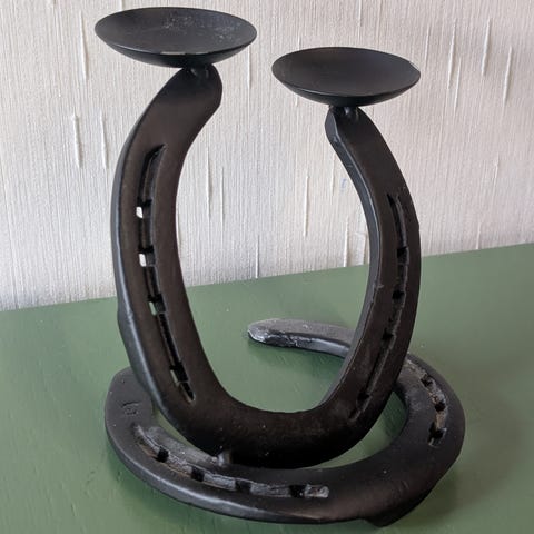 2 fine hesteskoer en med stativ for lysestaker eller noe henge/holde… jeg har brukt en stund som lysestaker, kan brukes på flere formål..