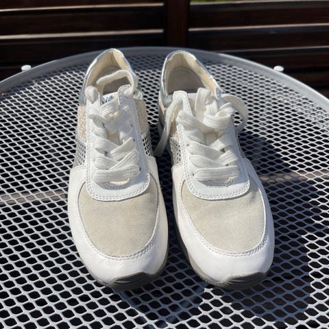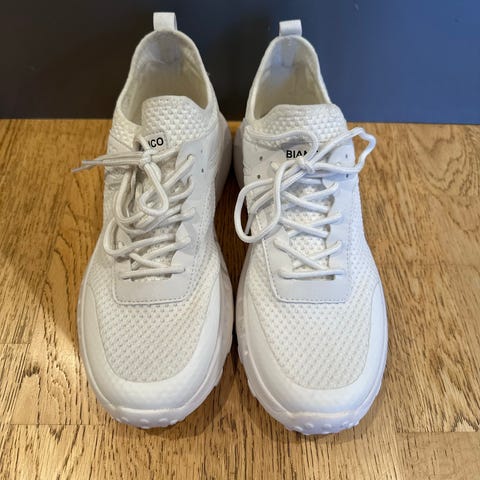 Bugatti joggesko i størrelse 43. Skoene er hvite med sorte lisser og har en såle med brune detaljer. Designet for hverdagsbruk med perforert materiale for ventilasjon.