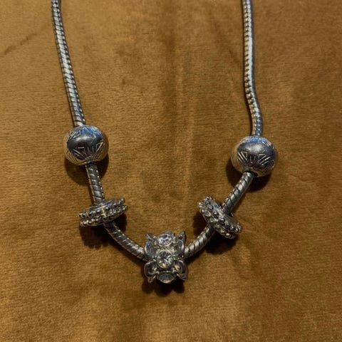 Halskjede med rå rav i forsjellige størrelser og naturlige former. Aldrig brukt. Stammer fra Danmark.