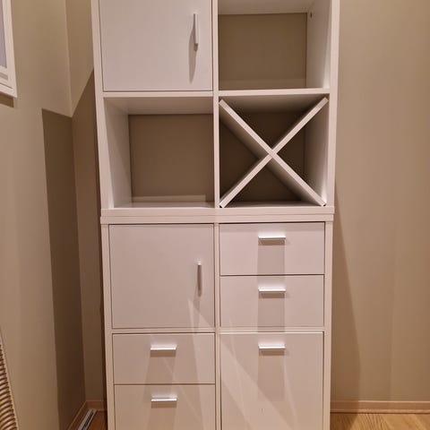 Pinnene og hyllene er fleksible, kan flyttes. Hylle for oppheng av glass, samt hyllekasse.