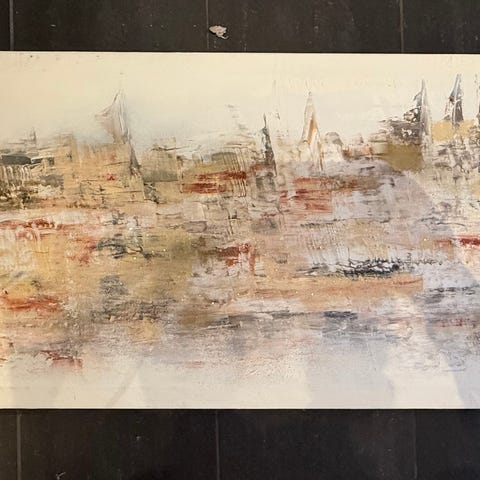 Abstrakt maleri sett i grå, beige, blå og gulltoner