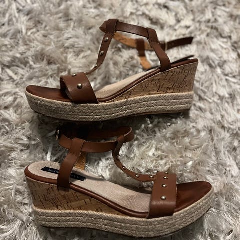 Jean Paul Sandaler i størrelse 39, brun farge. Sandalene har en kilehæl med flettet materiale og remmer med nagler.