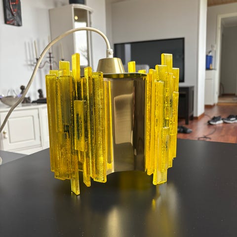 Retro lampe - dansk design av Claus Bolby for CEBO. I god stand, men noe slitasje på toppen - se bildet. Tøyledning i hvitt. Lampen er i metall og Gul akryl. Passer dessverre ikke inn der jeg hadde tenkt, så da søker den ny eier.