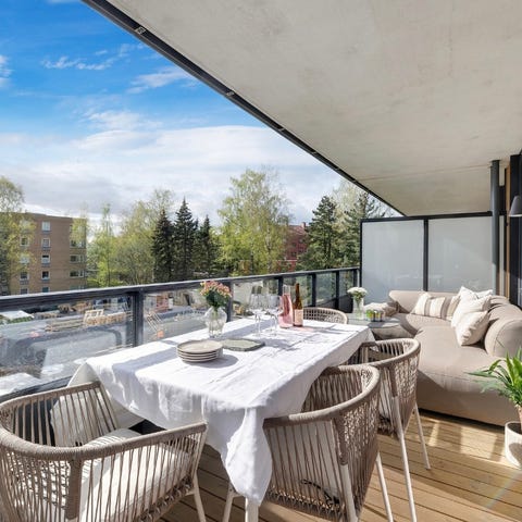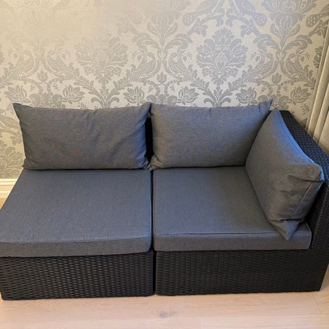 Utemøbel bestående av en sofa med puter i grått stoff og et salongbord i teak. Sofaen har metallramme med tre armlener. Bordet har bordplate i teak med rette bordplanker. Møblene er egnet for utendørs bruk på balkong eller terrasse.