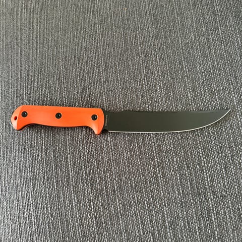 Dette er en god villmarkskniv for person med litt større hender. Har slire med lærreimer som gjør den lett å bære slik du ønsker det.