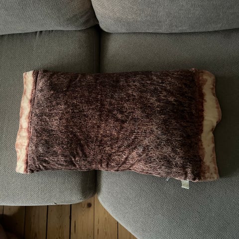 Godt brukt fake skinnpute. Brukt på sittebenk i gangen. Bruksmerkene skjules ved å ta motsatt side ut.