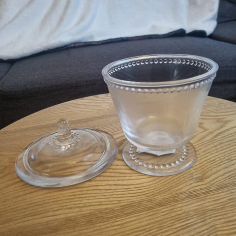 Produktet på bildet er en Kutani China sukkerskål. Den har et tradisjonelt japansk landskapsdesign, ofte med motiv som fjell (inkludert Fuji), trær og hus. 11x15cm