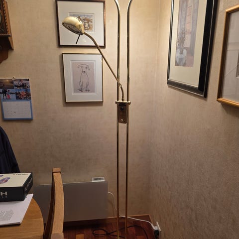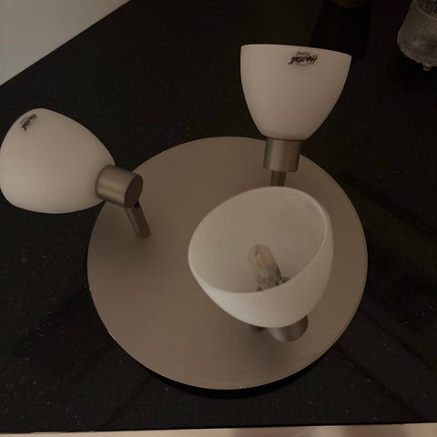 Pent brukt lampe fra Herstal. Platen i taket er i sølv/metall og måles til 24 cm i diameter. Tre lyspunkt, som gir et godt og behagelig lys.