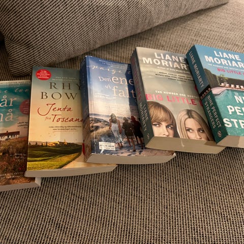 Pakke med 7 bøker inkludert titler som 'Jenta som ble igjen', 'Dreams of Fire', 'Øya', 'Tilbake til Riverdon', og 'Den glemte hagen'. Bøkene varierer i størrelse og farge.