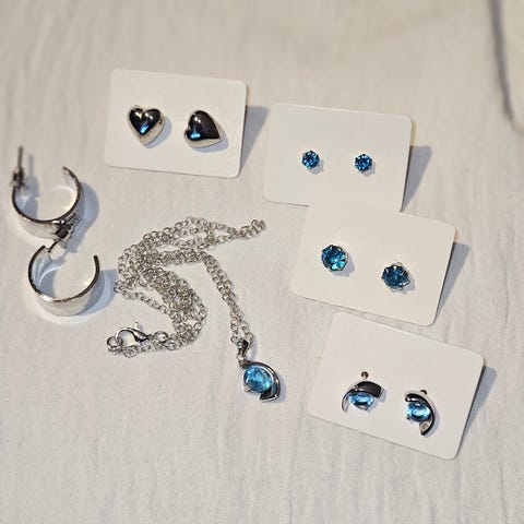 Flott stort smykkesett, anheng og tilhørende øredobber i sølvfarge og blå sten samt 2 sett øredobber ved siden av.