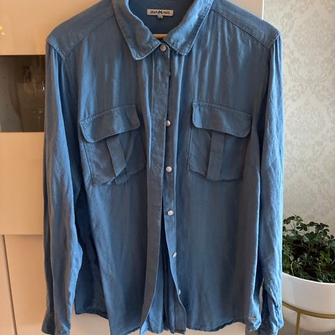 Bluse er brukt få ganger, faller pent. Lenger bak enn foran. Snøring nede. Str.m. Lys blå.