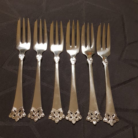 2 stk kakegafler i sølv i mønsteret Anitra selges samlet.